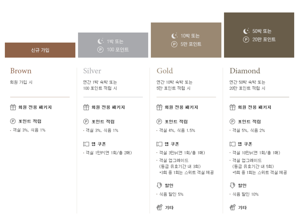 | 부가 혜택 | 아래 표 참 | 부대시설 할인 | 발렛파킹 쿠폰, 와인 반입 쿠폰, 예약 우선권 등 |